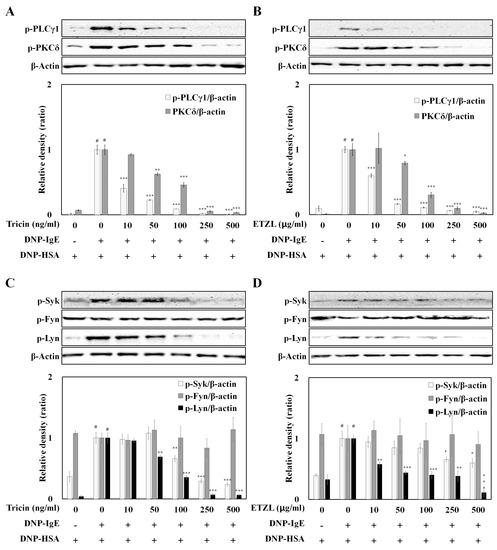 Inhibitory effect of tricin and ETZL on phosphorylation of proteins in the FcεRI signaling cascade in RBL-2H3 cells stimulated by an IgE–antigen complex. RBL-2H3 cells were seeded overnight in a 24-well plate at 37 °C; cultured cells were washed and further incubated with anti-DNP-IgE for 24 h. The cells were then incubated with varying concentrations of (A,C) tricin (10–500 ng/mL) or (B,D) ETZL (10–500 μg/mL) for 1 h, and subsequently stimulated by DNP-HSA for 4 h. All values are the mean ± S.E.M. of three independent experiments. Values of * p < 0.05, ** p < 0.01 and *** p < 0.001 were considered significantly different to the anti-DNP IgE plus DNP-HSA, unpaired Student’s t-test. # p < 0.001 compared to the control.