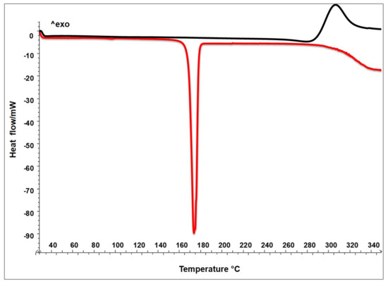 The thermograms in Figure 1 show the thermal behaviour of raw mannitol and chitosan. As expected, the thermogram of the crystalline sugar M presents a clear melting onset point at 165 °C and a melting peak at 173 °C (integration between melting onset and endset); that of solid amorphous C shows only an exothermal event around 308 °C due to the crystallization followed by the polysaccharide degradation [21].