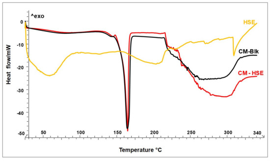 CM-HSE, blank and raw materials (C, M, and HSE) were analyzed by Differential Scanning Calorimetry on an indium calibrated Mettler Toledo DSC 822e (Mettler Toledo, OH, USA). Thermograms were recorded by placing accurately weighed quantities (8–10 mg weighed with a microbalance MTS, Mettler Toledo, OH, USA) of each sample in a 40 µL aluminium pan, which was sealed and pierced. The blank curve was automatically determined by the instrument. The samples underwent one dynamic thermal cycle; they were heated from 25 °C to 350 °C at a heating rate of 10 °C/min.