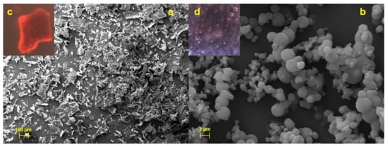 Unprocessed HSE appears as a crystalline material with irregular shape and surface (Figure 3a) and exploiting red fluorescence (Figure 3c).