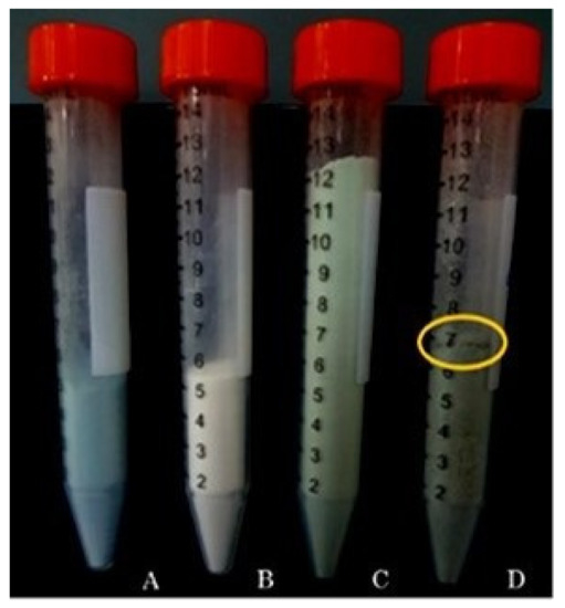 For the manufacturing industry is important to obtain a handling powder that remains stable and homogeneously mixed during the preparation process of different oral dosage forms, thus suitable for the preparation of supplements in form of pills or tablets [37]. Materials may segregate upon mixing and handling based on differences in particle properties such as size, density, or shape [37]. As shown in Figure 5, samples A, B, and C at the end of the mixing test resulted well packed and sample C constituted of CM-HSE plus Lactose/Mg Stearate resulted in homogeneous mixtures. On the other hand, sample D (HSE plus Lactose/Mg Stearate) resulted partially segregated, with a different breakpoint; this behaviour confirmed the difficulty and the unsuitability of HSE raw material to be incorporated in a solid dosage form.