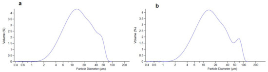 HSE, after harsh storage conditions over six months, showed an increase in dimensional distribution (Table 4) with d50 of 54.60 µm compared to the starting value of 39.76 µm. This behaviour could be related to the change in the solid-state of the extract from crystalline to final sticky material. As suggested by LLS analysis only a slight increment of particle distribution volume was observed at the end of the storage period) for CM-HSE (Figure 6a,b without significant d50 variation from 14.24 µm (a span value 2.66 µm, Table 2) to 15.51 µm (span value 3.21) after six months of storage (Table 4).
