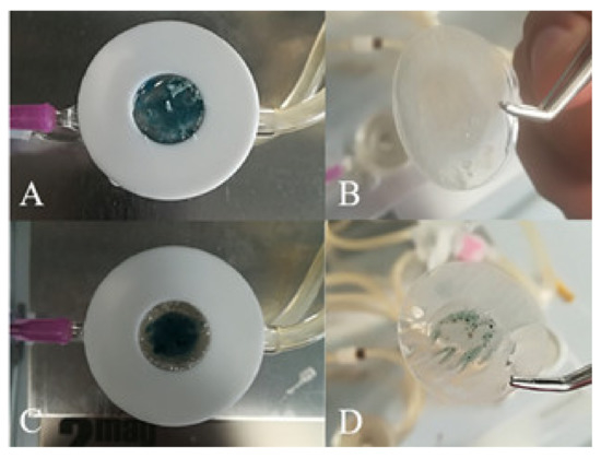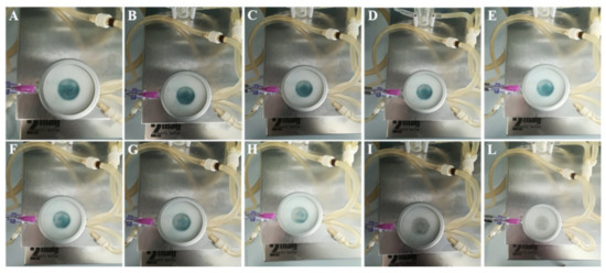 CM-HSE was gradually absorbed through Permeapad® in the acceptor chamber of Franz Cell apparatus, starting from t0 (A) up to 360 min (L), as shown in Figure 8. The typical blue-green colour of CM-HSE, markedly appreciable in the donor compartment of the apparatus in the first pictures (Figure 8A–E), progressively becomes less intense (Figure 8F–I) and completely transparent in L.