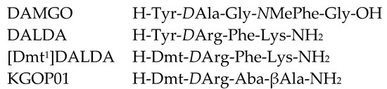 - Neilan, C.L.; Nguyen, T.M.; Schiller, P.W.; Pasternak, G.W. Pharmacological characterization of the dermorphin analog [Dmt1]DALDA, a highly potent and selective mu-opioid peptide. Eur. J. Pharmacol. 2001, 419, 15–23. [Google Scholar] [CrossRef]