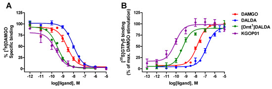 The high binding affinities to the human recombinant MOR expressed in CHO cells showed by DALDA and [Dmt1]DALDA confirms earlier data at the rat MOR in the brain tissue (Ki values of 1.69 nM for DALDA, and 0.143 nM for [Dmt1]DALDA) [32]. As shown in Table 1, replacement of the Tyr1 residue in DALDA with Dmt1 in [Dmt1]DALDA led to a significant increase (27-fold) in binding affinity to the human MOR, an observation that is in good agreement with findings at the rat MOR [32]. Additionally, exchanging Phe3-Lys4 residues in [Dmt1]DALDA with an unnatural, uncommon amino acid, respectively, in the Aba3-βAla4 sequence lead to in a new analogue, KGOP01 [34], which exhibited a further increase (ca. 2-fold) in the MOR affinity than [Dmt1]DALDA, and a 13-fold better MOR affinity than DAMGO (Table 1, Figure 2A).