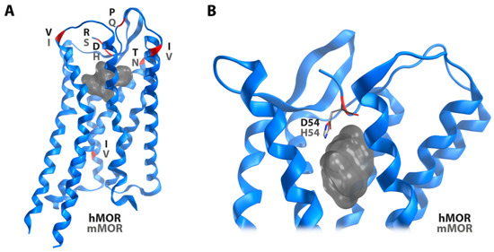 The murine (PDB ID: 5C1M) and the human MOR model differ only in seven amino acid residues as illustrated in red (A). Only one of these differing residues is directly pointing to the ligand binding site (B, grey surface). Whereas a histidine residue is at position 54 in the murine MOR, the human receptor has an aspartic acid at this position.