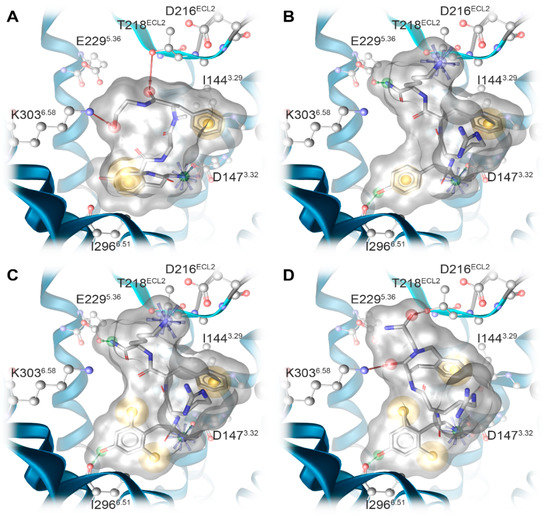 Docking of DAMGO, DALDA, [Dmt1]DALDA, and KGOP01 to the structural model of the human MOR (PDB ID: 6DDF) resulted in comparable binding orientations for the four peptides (Figure 5). Several receptor–ligand interactions were observed in all complexes (Figure 6), and an overview of detected receptor–ligand interactions is presented in Figure 7. Due to missing information on the role of the receptor’s N-terminus for ligand binding and the high flexibility of the peptide ligands, the interactions with the extracellular loop regions are more speculative than the interactions within the inner core region. As expected, D1473.32 forms a charge interaction with the primary amine of the tyrosine (in DAMGO and DALDA) or the Dmt (in [Dmt1]DALDA and KGOP01). Additionally, this primary amine of the tyrosine of DALDA and [Dmt1]DALDA forms a π–cation interaction with Y1483.33. The central role of D1473.32 and Y1483.33 for binding of DAMGO, morphine and morphinan ligands, and other small molecules to the MOR is well-recognized [23,24,25,26,27,28,48]. The phenol moieties of all ligands are pointing towards I2966.51 and form a hydrogen bond except for DAMGO. In theory, the phenol moieties could also form hydrogen bonds to water molecules as observed in the MOR crystal structure (PDB ID: 5C1M), but the role of water-mediated interaction networks for peptide ligands is still not clear. The phenyl rings of the phenylalanine (in DAMGO, DALDA, and [Dmt1]DALDA) fill a hydrophobic pocket that comprises the aliphatic chain of I1443.29 residues. While the Aba moiety of KGOP01 only reaches I1443.29, it also makes KGOP01 more rigid and thereby allows for a potentially highly favorable hydrogen bond with K3036.58. Interestingly, the methyl group of the alanine of DAMGO shows unique lipophilic contacts with W3187.34 and I3227.38 residues, which could not be observed for the other peptides. In comparison, DAMGO and KGOP01 are more similar in terms of their hydrogen bonding pattern including T218ECL2 and K3036.58. Further, DALDA and [Dmt1]DALDA only differ in the additional lipophilic contact of [Dmt1]DALDA with Y3267.42. Overall, the four targeted opioid peptides show comparable binding modes to the MOR. The tyrosine/Dmt ring of all four peptides shows lipophilic contacts with M1513.36, I2966.51, and V3006.55 residues. The two methyl groups of the Dmt moiety in [Dmt1]DALDA and KGOP01 show additional lipophilic contacts with Y1483.33 and Y3267.42 residues, which might lower the entropic penalty upon binding (Figure 8). The latter rigidification effect might also strengthen the hydrogen bond with I2966.51 residue (Figure 6).