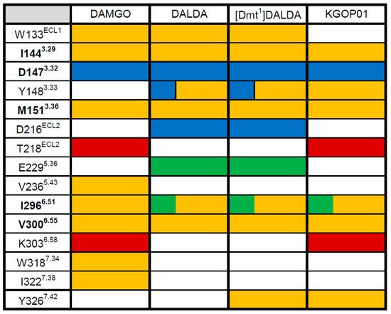 Ligand–MOR interaction pattern derived from molecular docking solutions of opioid peptides DAMGO, DALDA, [Dmt1]DALDA, and KGOP01. Yellow fields indicate lipophilic contacts, red fields hydrogen bond acceptors, green fields hydrogen bond donors, and positively charged centers are shown as blue fields. White fields indicate the absence of an interaction with that residue. Residues which show the same type of interaction for all morphinan ligands are marked in bold.