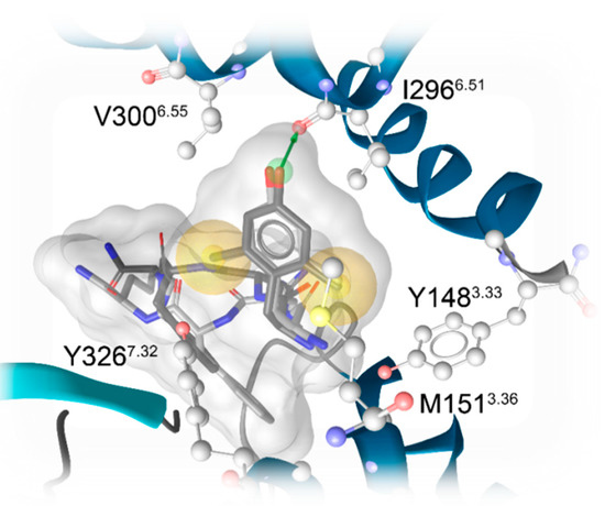 Hydrophobic environment of Dmt moieties of [Dmt1]DALDA (light grey) and KGOP01 (dark grey). The two methyl groups show additional hydrophobic contacts with Y1483.33 and Y3267.32, respectively, which are not observable for DAMGO or DALDA. Yellow spheres indicate lipophilic contacts and green arrows hydrogen bond donors. For clarity, only interactions of the Dmt moiety are shown.