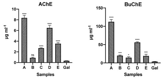 AChE and BuChE inhibitory activities of five different Phaedranassa Herb. species from Ecuador. Values are expressed as IC50 (µg·mL−1). A: P. cinerea; B: P. cuencana; C: P. dubia; D: P. glauciflora; E: P. tunguraguae; GAL: Galanthamine control. **** p < 0.0001, *** p < 0.001, * p < 0.5, and ns (not significant).