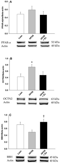 - Broderick, T.L.; Cusimano, F.A.; Carlson, C.; Tamura, L.M. Acute exercise stimulates carnitine biosynthesis and OCTN2 expression in mouse kidney. Kidney Blood Press. Res. 2017, 42, 398–405. [Google Scholar] [CrossRef] [PubMed]