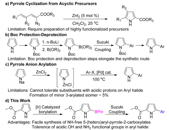 The groups of Smith-Maleczka and Hartwig-Miyaura have reported an iridium-catalyzed borylation reaction which can directly functionalize aromatic C−H bond to a boronic ester group [59,60,61,62]. This methodology has also been successfully utilized to prepare heteroarylboronic esters of pyrroles [63,64,65], indoles [66,67,68,69], thiophenes [70], pyridines [71,72,73], and other heteroaromatics [74]. This reaction can tolerate pyrrole N-H functional group and hence does not need N-protection for the synthesis of pyrroleboronic esters. N-H free pyrroles are easily borylated on the 2-position while N-protection can be used to direct borylation at the 3-position [75,76]. N-Boc protected 3-borylated pyrroles have been employed in Suzuki coupling to access 3-arylpyrroles [77]. On the other side, N−H unprotected pyrroleboronic esters have been much less utilized for Suzuki coupling [78]. Our group has been interested in exploring catalytic C–H borylation reactions for organic synthesis [72,79,80,81,82,83,84,85,86]. A recent report about failure of installation of highly electron-rich aromatic substituent on pyrrole by direct arylation [52] prompted us to investigate Suzuki coupling route for this purpose. Herein, we describe the application of iridium-catalyzed borylation−Suzuki coupling route for a concise two-step synthesis of 5-aryl pyrrole-2-carboxylates.