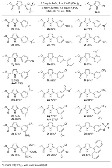 This N-H free borylated pyrrole has a long shelf life as no apparent decomposition was detected by GC-MS even after two years. The borylated pyrrole 1 was subsequently subjected to Suzuki coupling to synthesize 5-aryl substituted pyrrole-2-carboxylates. The pyrrole boronic ester easily underwent Suzuki-coupling with (hetero)aryl bromides using Buchwald’s Pd(OAc)2/SPhos catalyst system [88] as well as by the Pd(PPh3)4 catalyst (Scheme 2).