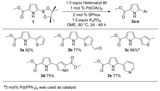 Suzuki coupling with heteroaryl halides was also examined to synthesize 5-heteroaryl substituted pyrrole-2-carboxylates (Scheme 3). Heteroaryl bromides of thiophene (entries 3a–3c) [34], pyrrole (3d) [90], and pyridine (3e) [38] all gave excellent isolated yields of corresponding bi-heteroaryl products. During the formation of 3d, very small amounts (~5–7%) of two homocoupling products (originating by the homocouplings of boronic ester, and bromopyrrole, with themselves) were also observed by GC-MS. However, the cross-coupled product was formed as the major product and was isolated in 75% yield. This entry (3d) again signifies the advantage of the current route over direct pyrrole arylation protocols, which cannot be used to prepare such NH-free 2,3’-bi-pyrroles [91,92].
