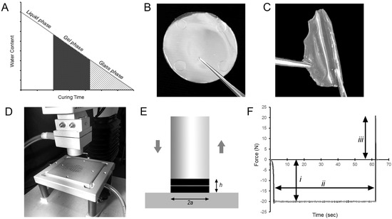 Polymer-polymer adhesion testing between glass- and gel-phase films. (A) Liquid pectin solutions (3% w/w) were cured in a low-humidity environment; the progressive evaporation of water created the gel phase and glass phase films used in these studies. (B,C) The films in the gel phase (38–41% w/w Wc) were soft and flexible. The glass phase films (10–13% w/w Wc) were hard and brittle. (D) Polymer-polymer adhesion experiments were performed with a custom fixture composed of a flat-ended cylindrical probe and parallel fixture surface for a preset development time. The cylindrical probe compressed the two polymers followed by the separation of the probe from the surface by an applied tensile load. (E) The fixture ensured that the radius of contact was defined as the radius of the probe (a) and the thickness of the contacted polymers was h. The pre- and post-experimental geometries were nearly equivalent for large values of a/h with minimal edge effects. (F) The data from a standard adhesion test reflected the compression force applied by the probe (i), the development time (ii) and the strength of the polymer-polymer adhesion during probe separation (iii).