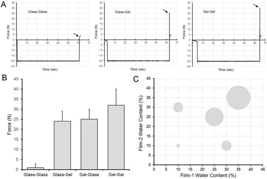 The adhesivity of two glass phase films (glass-glass) was less than 5 N (Figure 2A). The adhesivity of one glass phase and one gel phase films (glass-gel) was 25 ± 3 N (Figure 2A). The adhesivity of two gel phase films (gel-gel) was 30 ± 3 N (Figure 2A). The adhesive strength of glass-glass films was significantly less than the adhesive strength of glass-gel or gel-gel films (p < 0.0001) (Figure 2B,C).