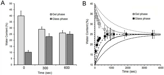 To assess the potential diffusion of water between a gel phase film (40 ± 3% Wc) and a glass phase film (11 ± 2% Wc), the films were compressed, then separated at various time intervals after initial contact. The water content was assessed by film weight. The standard glass and gel phase films reached a water equilibration within 10 min (Figure 3A). Since the diffusivity of water through the pectin medium is unknown, we plotted the empirical diffusion data against theoretical plots reflecting a range of diffusion coefficients at 25 °C. The diffusion coefficient of water through the pectin films was estimated to be 2.5- to 5-fold slower than the self-diffusion coefficient of water (Figure 3B).
