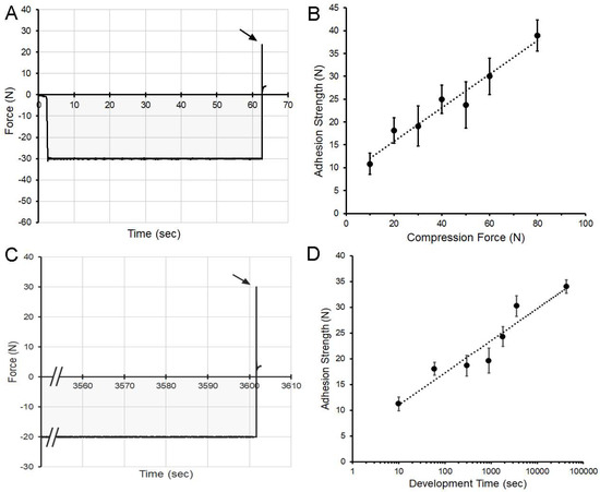 The effect of polymer-polymer compression on adhesivity was assessed using an adhesion assay with two gel phase polymers. The compressive force, varied from 10 N to 80 N, was applied for 60 s (Figure 4A,B). The adhesive strength increased with increasing compression (R2 = 0.956) (Figure 3B). To study the influence of development time on polymer-polymer adhesion, a controlled humidity microenvironment was used to maintain polymer water content over time. Gel phase films were compressed with a force of 20 N for time periods varying from 10 s to 12 h (Figure 4C,D). The compression time and adhesive strength demonstrated a logarithmic relationship (R2 = 0.913) with most of the adhesive force developing within minutes of contact (Figure 4D).
