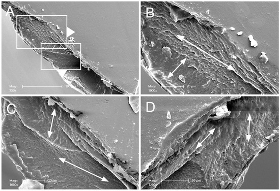 Scanning electron microscopy (SEM) of pectin polymer-polymer films. Conjoined films were produced by compressing two gel phase films at 20 N for 60 s followed by curing to the glass phase. The glass phase conjoined films were sharply divided at the midpoint and examined by SEM. (A) A polymer-polymer interface is at the cut surface. (B–D) High resolution images of the conjoined films. Evidence for a cross-grain effect is illustrated by the arrows.