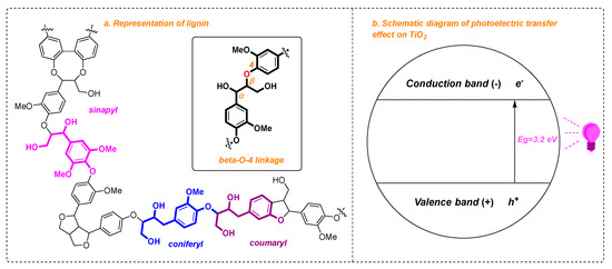 (a). Representative structure of lignin and beta-O-4 linkage in lignin, (b). Schematic diagram of photoelectric transfer effect on TiO2.