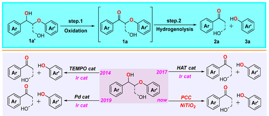 While fossil fuels were widely regarded as the primary source for chemicals and energy, the fraction of chemicals and fuels obtained from renewable resources, such as biomass, can be expected to be good alternatives in the future [1,2,3,4,5]. Lignin contains complex natural aromatic subunits (sinapyl, coniferyl, coumaryl), and diverse types of linkages (β-O-4, α-O-4 and 4-O-5) [6,7]. Among these types of ether bonds, β-O-4 is the most abundant linkage in lignin, resulting in a variety of studies focused on the cleavage of the β-O-4 bond employing lignin dimeric model compounds (Figure 1a) [8,9]. In the past decades, tremendous efforts have been devoted into the degradation of lignin by Hartwig [10], Baker [11], Dyson [12], Ellman [13], Barta [14], etc.