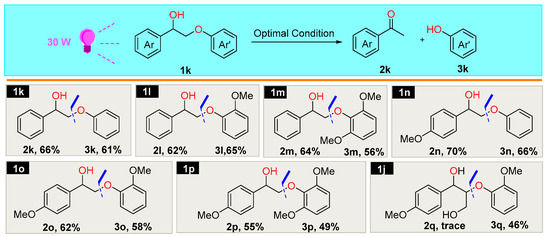 Inspired by the excellent performance of two-step strategy, that is PCC oxidation in the first step followed by 20 wt.% Ni/TiO2 photocatalysis under the optimal reaction condition for the efficient cleavage of the β-O-4 bond. Then, the hydrogenolysis of C-O bond was further studied in more detail by varying the substituent groups on the benzene ring (Scheme 3). Owing to the successful two-step strategy for the transformation of β-O-4 alcohol to corresponding aromatics. However, the yields of aromatics exhibited only a slight decrease in Scheme 3, due to the loss of substrates in the two-step process. When no substituted groups on the benzene ring, 1k could reach a high conversion to yield 66% of acetophenone and 61% of phenol. Methoxy substitutions of O-terminus aryl resulted in no apparent decrease in yields compared to 1k, which was similar to the above study of β-O-4 ketones. Therefore, sing-ortho-substituted alcohol 1l and bis-ortho-substituted alcohol 1m delivered ketone products 2l (62%), 2m (64%) and phenol products 3l (65%), 3m (58%), respectively, after 12 h at room temperature. Moreover, coumaryl-based system (1n–1p) was soon carried out in the two-step Ni/TiO2-mediated photocatalytic strategy. It was satisfactory to find that methoxy-substituted alcohols 1n–1p were tolerated with no apparent decrease in yields, delivering phenol 3n, guaiacol 3o and syringol 3p in a yield of 66%, 58% and 49%, respectively. Based on the previous study of β-O-4 model compound (1j) in Scheme 2, we attempted the two-step strategy for the transformation of 1j. Unfortunately, oxidation PPC showed an excellent activity to turn α-hydroxyl group and γ-hydroxyl group to corresponding ketone and aldehyde, resulting in the failed generation of 2q. Above all, it could be verified that the two-step strategy was highly efficient for the transfer hydrogenolytic cleavage of the β-O-4 bond in a variety of lignin-derived model compounds.