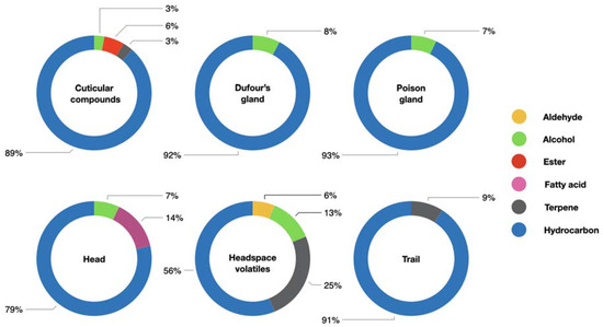 Previous studies of O. smaragdina chemical ecology have yielded a fragmentary and incomplete knowledge of the compounds produced and emitted by this ecologically and economically important ant species [15,16,17]. We identified a total of 59 compounds from the cuticle, Dufour’s gland, poison gland, head, headspace volatiles, and trails of O. smaragdina workers, including aldehydes, alcohols, carboxylic acid, esters, fatty acids, terpenes and hydrocarbons (Figure 1). This analysis provides essential foundations for functional studies investigating the role of specific compounds, as well as investigation of regional and colony variation in chemical profile.