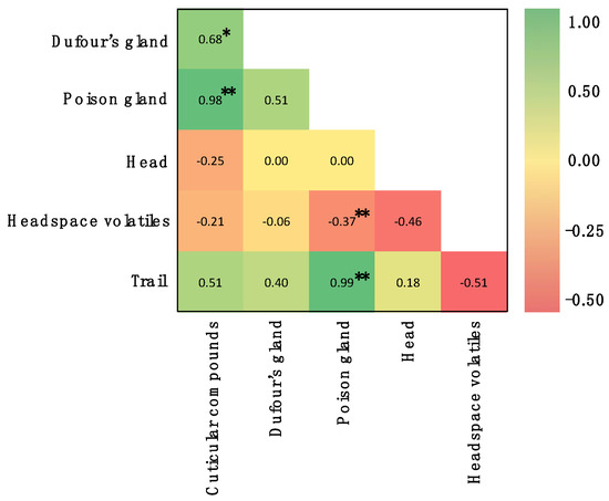 Multivariant correlation analysis of compounds isolated from different body parts, headspace, and trails of Oecophylla smaragdina. Analysis was based on the concentration and presence/absence of compounds. Pearson R value and P value were used as benchmark to determine the origin of compounds. Significance is denoted by * (<0.01); ** (<0.001).