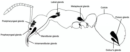 - Billen, J. Diversity and morphology of exocrine glands in ants. In Proceedings of the XIX Simposio de Mirmecologia, Ouro Preto, Brasil, 17–21 November 2009; pp. 1–6. [Google Scholar]