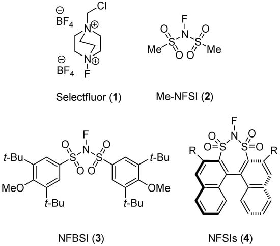 Over the last two decades, the chemistry of fluorine-containing compounds has emerged as one of the exciting areas of multidisciplinary research. The most notable impact of fluorine can be seen in materials [1,2,3,4,5,6,7,8,9,10], agriculture [11,12,13] and health-related industries [14,15,16,17,18,19,20,21,22]. To sustain the continuous advancement and pace of the innovations enabled by fluorine, many research groups are focusing on new methodological inventions allowing for more selective and economical syntheses of structurally diverse fluoro-organic compounds [23,24,25,26,27,28]. For instance, the recent progress in asymmetric synthesis of fluorine-containing tailor-made amino acids [29,30,31,32,33,34,35,36,37,38,39,40,41,42,43,44,45,46,47,48] was stimulated by growth in their applications to drug design [49] magnetic resonance imaging [50,51], positron emission tomography [52,53], and peptide/protein engineering [54,55,56,57,58,59,60]. Nevertheless, while some complex polyfunctional fluorine-containing molecules possessing useful properties represent the ultimate target of synthetic chemistry, more fundamental research still focuses on the formation of the C–F bond. In this regard, electrophilic fluorination is one of the most pioneering and rapidly developing areas of study [61,62,63,64,65,66,67]. Conceptually, this approach requires a carbon-centered nucleophile and an electrophilic source of fluorine. While the former is a well-established chemical unit, the “electrophilic fluorine” is still a rather exotic and mechanistically controversial entity [68,69,70,71]. The major thrust of research activity in this field was centered on the development of the corresponding reagents capable of releasing the required “electrophilic fluorine”. The most successful results have been achieved utilizing compounds with N–F bonds. For example, as presented in Figure 1, 1-chloromethyl-4-fluoro-1,4-diazoniabicyclo[2.2.2]octane bis(tetrafluoroborate) (1), introduced by Professor E. Banks [72], also known as Selectfluor, is one of the best reagents used as a source of “electrophilic fluorine”. Other reagents, developed by Professor N. Shibata [73,74,75,76], are N-fluoro-N-(methylsulfonyl)methanesulfonamide (Me-NFSI) (2), 3,5-di-tert-butyl-N-((3,5-di-tert-butyl-4-methoxyphenyl)sulfonyl)-N-fluoro-4-methoxybenzenesulfonamide (NFBSI) (3) and axially chiral NFSIs (4), which can be used for enantioselective fluorination [77]. All these reagents are shelf-stable, easy to handle and operationally convenient to use for various synthetic applications [78,79,80,81]. However, the preparation of N-F reagents usually requires molecular fluorine [72,82], rendering them rather expensive and not practical for large-scale syntheses.