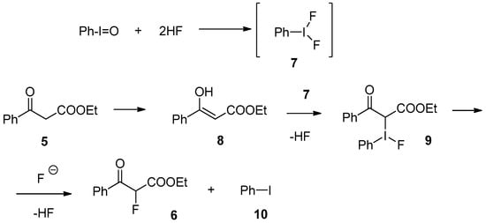 In 2011, Professor T. Kitamura’s group has reported that mixing ethyl 3-oxo-3-phenylpropionate (5) with 1.2 equivalents of a hypervalent iodine compound and excess (10-fold) of 55% aqueous HF resulted in formation of the corresponding ethyl 2-fluoro-3-oxo-3-phenylpropionate (6) in up to 98% chemical yield (Scheme 1) [83].