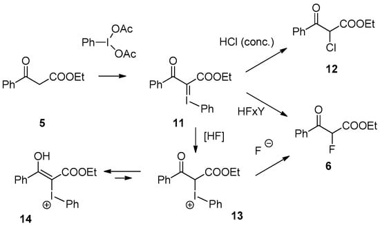 Some support for the proposed mechanistic pathway can be derived from the reactions of iodonium ylides with HF and HCl [105]. As shown in Scheme 3, iodonium ylide 11 can be prepared in quantitative yield by the reaction of keto ester 5 with (diacetoxyiodo)benzene in the presence of KOH in MeCN [106].