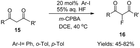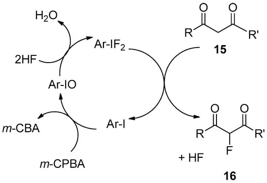 Considering the postulated reaction mechanism (Scheme 2) involving eventual transformation (reduction) of iodosylbenzene to iodobenzene 10, the final reaction product, the authors posited that providing in situ efficient oxidation of the latter to iodosylbenzene, would allow for a catalytic version of this process. Indeed, a significant breakthrough was made with the application of m-CPBA as a terminal oxidant [109]. As presented in Scheme 5, the Ar-I, used in catalytic amounts, undergoes a three-step transformation: oxidation to Ar-IO, reaction with HF to produce Ar-IF2 and reaction with the enolate form of 15 giving rise to the target product 16.