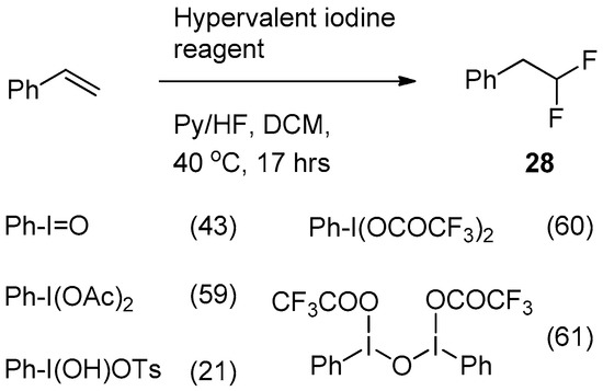 The synthesis of difluoromethyl-containing compounds via reaction of styrene derivatives with fluorinated hypervalent iodine reagents or iodine in the presence XeF2 [150,151,152,153,154,155,156] is also a known method. However, the necessity of preparing hypervalent iodine compounds or the use of XeF2 limits its synthetic applications. With this in mind, Kitamura’s approach was examined for the fluorination of styrene substrates [157]. As presented in Scheme 10, a series of hypervalent reagents were screened and the trifluoroacetoxy derivatives were identified as the best.