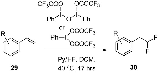 Application of these reaction conditions for fluorination of various substituted styrenes gave rather good results. This approach was applied to substrates 29 (Scheme 11) bearing alkyl, halo and OAc-type substituents in the o-, m- or p-position on the phenyl ring. The chemical yields of difluorinated products 30 ranged from 50% to 93%.