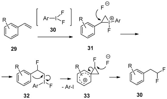 Some structural limitations of this method may arise from a mechanism involving the migration of an aryl group. As presented in Scheme 12, in situ generated electrophilic hyper-iodide reagent 30, reacts with starting styrene 29 to form three-ring intermediate 31 which is opened with fluoride to afford mono-fluorinated compound 32. The latter proceeds to a second spirocyclic three-ring intermediate 33 with the elimination of Ar-I. The final step of the process is the nucleophilic opening of 33 with fluoride to give the difluorinated product 30. One can assume that the stability of intermediate 33 will be strongly influenced by the electronic properties of the substituents on the aromatic ring. Nevertheless, as mentioned above, moderately electron-donating/withdrawing substituents, such as alkyl groups and halogens, can be tolerated giving product 30 with synthetically attractive chemical yields.