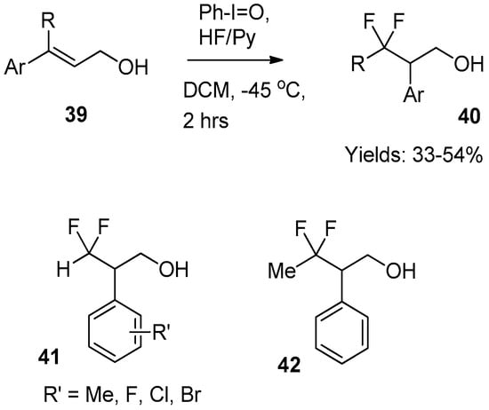Of particular interest are the results reported for the fluorination of cinnamyl alcohol derivatives [160]. As presented in Scheme 15, starting compounds 39 were treated with Ph-I=O and HF/Py in dichloromethane to furnish fluorinated products 40.