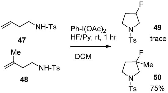 Compounds containing the 3-fluoropyrrolidine moiety possessing a wide spectrum of biological properties. Some of them have been developed as dipeptidyl peptidase inhibitors [160,161,162,163], glucokinase activators [164] prolyl oligopeptidase inhibitors [165] and purine nucleoside phosphorylase inhibitors [166]. The most commonly used synthetic approach for preparation of 3-fluoropyrrolidines is based on fluorine substitution for hydroxy group in 3-hydroxylpyrrolidines [167,168,169,170,171]. Another approach, based on aminofluorination of alkenes [172,173,174,175,176], is more practical allowing both ring construction and introduction of a fluorine atom in one convenient synthetic sequence. It was found that the aminofluorination version of this approach can be successfully realized using the Kitamura fluorination protocol. As presented in Scheme 16, treatment of homoallyl amines 43 with a hypervalent iodine reagent and HF/Py afforded 3-fluoropyrrolidines 44 with respectable yields ranging from 50% to 87% [177].