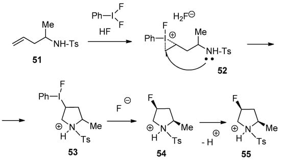 According to the proposed mechanism, the formed in situ (difluoroiodo)benzene is activated by HF and interacts with the nucleophilic double bond of homoallyl amine 51 resulting in formation of the cyclic iodonium salt 52. The three-membered ring is opened next by the nitrogen, attacking the terminal carbon by the bridged iodonium salts 52 to afford pyrrolidine 53. The formation of intermediate 53 is followed by SN2 substitution by a fluoride ion. The final step is the deprotonation of 54 giving rise to the final 3-fluoropyrrolidine product 55.