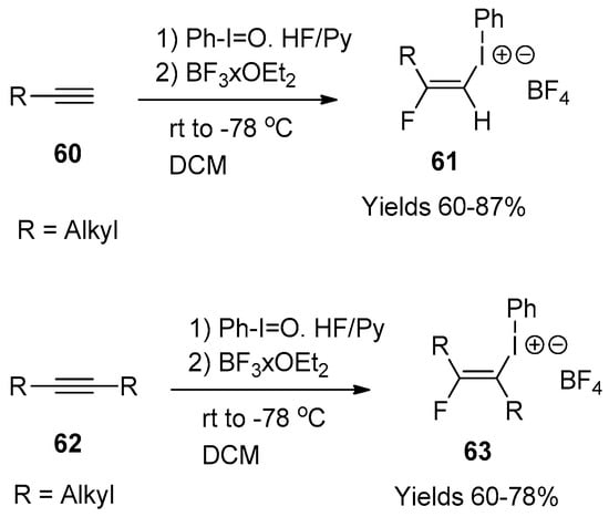 - Kitamura, T.; Mizuno, S.; Muta, K.; Oyamada, J. Synthesis of β-Fluorovinyliodonium Salts by the Reaction of Alkynes with Hypervalent Iodine/HF Reagents. J. Org. Chem. 2018, 83, 2773–2778. [Google Scholar] [CrossRef]