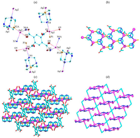 The 3D MOF structure was also analyzed from a topological perspective [34,35], namely by generating a simplified topological net (Figure 1d). It was built from the 3- and 4-connected Ag1 and Ag2 nodes, the 3-connected µ3-PTA and 4-connected µ4-pma4− nodes, and the 2-connected µ-PTA linkers. As a result, a tetranodal 3,3,4,4-linked net with unique topology was identified, described by the (5.72)2(52.7)2(52.72.82)2(72.82.102) point symbol with the (5.72), (52.7), (52.72.82), and (72.82.102) indices referring to the Ag1, µ3-PTA, Ag2, and µ4-pma4− nodes, respectively.