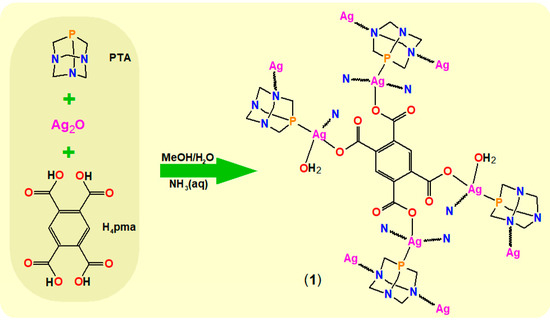 Following our general research interest on the use of 1,3,5-triaza-7-phosphaadamantane as a versatile P,N-linker for the assembly of novel metal–organic architectures with diverse functional properties [16,17,18,19,20,21,22], in this work, we focused on further exploring a multicomponent system composed of silver(I) ions, PTA, and carboxylic acid building blocks to generate a new bioMOF. We report herein the synthesis, characterization, crystal structure, and a diversity of bioactivity tests for a novel 3D bioMOF [Ag4(µ-PTA)2(µ3-PTA)2(µ4-pma)(H2O)2]n·6nH2O (1) (H4pma = pyromellitic acid). This compound features a notable multifaceted bioactivity ranging from antibacterial and antifungal behavior to antiviral and cytotoxic properties, as described below.