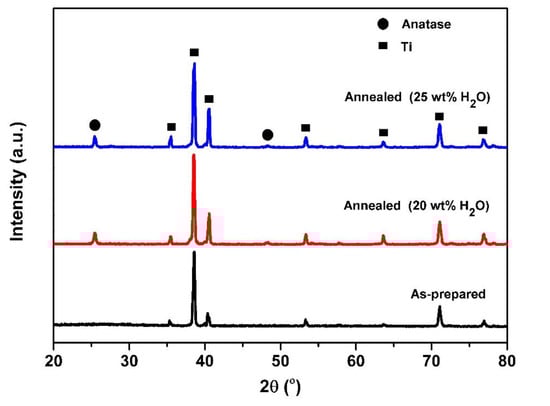 XRD patterns of TiO2 nanotubes (TiO2 NTs) obtained from anodization of Ti-6Al-4V alloy (before and after annealing treatment) at different water contents: 20 wt% and 25 wt% H2O.