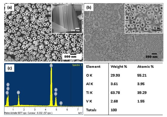 SEM images of TiO2 NTs obtained from the anodization of Ti-6Al-4V alloy in fluoride ethylene glycol electrolyte with different water contents: 20 wt% H2O (top view in the inset) (a) and 25 wt% H2O (b), and the energy-dispersive spectroscopy (EDS) elemental spectrum of the anodized Ti-6Al-4V alloy (c).