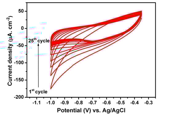 In the present study, the electrochemical deposition of the polymer electrolyte into TiO2 NTs is achieved by the cyclic voltammetry (CV) technique. The nanotubes synthesized in ethylene glycol electrolyte containing 20 wt% water are used for the electropolymerization of the polymer electrolyte into the nanotubes. The starting monomer is methyl ether methacrylate poly (ethylene glycol) (MMA-PEG, Mw: 500). The upper potential limit was set according to the open circuit voltage of the system, which is around −0.35 V versus Ag/AgCl (3M KCl), and the lower limit was set to −1V versus Ag/AgCl (3M KCl) [36]. The starting monomers are electropolymerized into short chains of PMA-PEG, where PMA is used to enhance the mechanical properties and PEG is responsible for the ionic conductivity of the polymer electrolyte. The reaction mechanism of MMA-PEG electropolymerization into TiO2 NTs is based on the formation of intermediate hydrogen-free radicals [37]. For cathodic applied potentials, the reduction of H+-producing H2 is accompanied by the formation of hydrogen-free radicals that can react with the monomers, leading to the polymerization of methyl methacrylate (PMMA). Figure 3 shows the cyclic voltammogram of the polymer-coated TiO2 NTs for 25 cycles. Clearly, the absolute value of the cathodic current at −1 V versus Ag/AgCl (3M KCl) drops as the increment of cycles. The reason for the obvious fading can be explained by the successive growth of thin insulating polymer layers on the walls of TiO2 NTs.