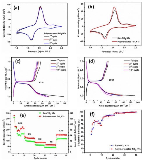 Figure 5c,d depicts the galvanostatic charge–discharge profiles of polymer-coated TiO2 NTs. The profiles display flat plateaus of charge at 1.85 V versus Li/Li+ and discharge 1.76 V versus Li/Li+, which are typical profiles for anatase TiO2 NTs as obtained from XRD results. The first charge and discharge capacities for polymer-coated TiO2 NTs are 74.9 µAh cm−2 µm−1 (176.8 mAh g−1) and 139.2 µAh cm−2 (328.5 mAh g−1) µm−1, respectively, corresponding to a Coulombic efficiency (CE) of 53.78%. Meanwhile, the bare TiO2 NTs shows flat plateaus of charge at 1.86 V versus Li/Li+ and discharge 1.74 V versus Li/Li+, a delivering charge capacity of 59 µAh cm−2 µm−1 (139.2 mAh g−1) and a discharge capacity of 132.5 µAh cm−2 µm−1 (312.7 mAh g−1) with a significantly lower CE of 44.5% compared to that of polymer-coated TiO2 NTs. The specific discharge capacity of the polymer-coated TiO2 NTs is higher compared to some previous studies. For instance, Fasakin et al. [38] reported that an anatase TiO2 NTs prepared from pristine anatase TiO2 nanoparticles via a low temperature modified stirring-hydrothermal technique delivered a capacity of 160 mAh g−1 at a specific current of 36 mA g−1. Auer et al. [39] studied the TiO2 NTs synthesized by a two-step anodization process, and the anatase TiO2 NTs exhibited a reversible capacity of 185 mAh g−1 (Li0.55TiO2) at a slow C-rate (C/20). In addition, Savva et al. [40] synthesized ordered TiO2 NTs via electrochemical anodization and subsequently annealed under N2 and water-vapor (WV) atmospheres. The obtained capacities for the N2 and WV-treated TiO2 NTs were 231.9 mAh g−1 and 230.6 mAh g−1 at C/20, respectively.