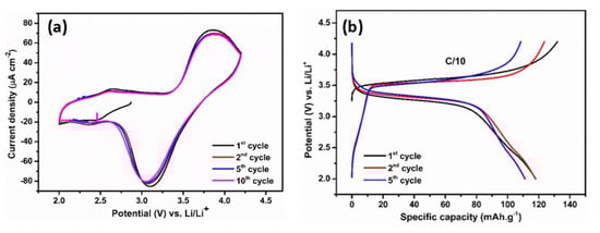 Cyclic voltammogram (a) and typical galvanostatic charge/discharge profiles (b) of LiFePO4 at C/10 rate in the potential range of 2–4.2 V vs. Li/Li+.