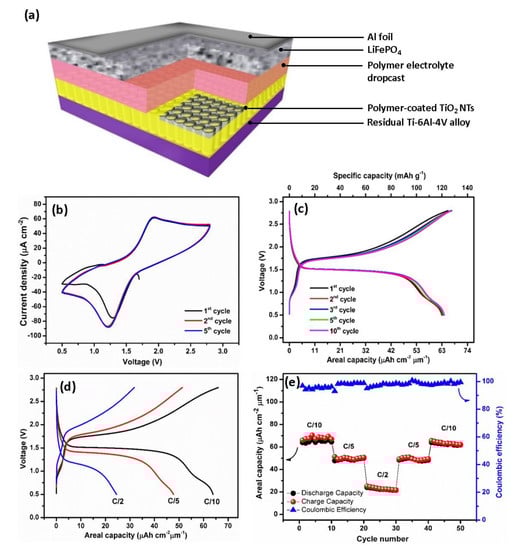 All-solid-state batteries were assembled using bare and polymer-coated TiO2 NTs and LiFePO4. After drying the polymer-coated TiO2 NTs electrode at 70 °C for 24 h, 7 µL of the MMA-PEG carrying LiTFSI salt was drop-casted at the polymer-coated TiO2 NTs surface. The sample was dried again under vacuum at 70 °C for 24 h to obtain a homogeneous polymer thin film. The cells consisting of a polymer-coated TiO2 NTs anode and an LiFePO4 cathode were assembled in an argon-filled glove box (MBraun, Munich, Germany) with <0.5 ppm H2O and <0.5 ppm O2 atmosphere. The LiFePO4 composite cathode on the Al disk was pressed to polymer-coated TiO2 NTs and a polymer electrolyte dropcast. Two wires were connected to the backside of each current collector using silver conductive paste and wires.
