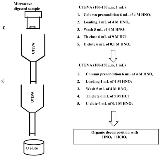 A new separation method was developed to separate U from the soil matrix using two UTEVA extraction chromatographic resin columns. A synthetic mixture was prepared by mixing 1 mL of XSTC-1 (La, Ce, Pr, Nd, Sm, Eu, Gd, Tb, Dy, Ho, Er, Tm, Yb, Lu, Y; 10 μg mL−1), 1 mL of XSTC-13 (Th, Ag, Al, As, Ba, Be, Bi, Ca, Cd, Co, Cr, Cs, Cu, Fe, Ga, In, K, Li, Mg, Mn, Na, Ni, Pb, Rb, Sr, Tl, V, Zn, U, Hg; 10 μg mL−1) and 10 mL of Fe (1000 μg mL−1) for UTEVA extraction chromatographic resin experiment. The synthetic mixture of loading solution was prepared in the ratio of U and Fe as 1:1000. The UTEVA resin was precleaned by soaking overnight in 6 M HNO3 and then washed multiple times with Milli Q water. Finally, the precleaned UTEVA resin was stored in 0.5 M HNO3. The UTEVA column was prepared with 1 mL of precleaned UTEVA resin and preconditioned with 4 M HNO3. The schematic chemical separation for U using two UTEVA resin columns is given in Figure 1.