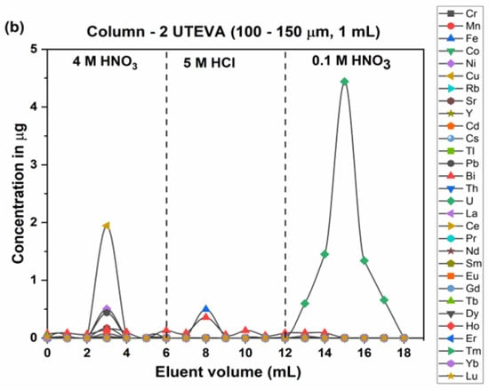 The loading solution was conditioned to 4 M HNO3 and passed through the UTEVA column. The alkali metals (Li, Na, K, Rb and Cs), alkaline earth metals (Be, Mg, Ca, Sr and Ba), heavy metals (V, Cr, Mn, Fe, Co, Ni, Cu, Zn, Ga, As, Ag, Cd, In, Hf, Tl, Pb, Bi and Hg) and rare earth elements (La, Ce, Pr, Nd, Sm, Eu, Gd, Tb, Dy, Ho, Er, Tm, Yb, Lu and Y) were washed off with 6 mL of 4 M HNO3 from the column. Later, Th was eluted with 6 mL of 9 M HCl. Recovery of Th was about 90% in this fraction. Finally, U was eluted by passing 6 mL 0.1 M HNO3 onto the column. Recovery of U was about 90%. The elution profiles of U chemical separation from the synthetic mixture of elements contained in XSTC-1, XSTC-13 and Fe solution are given in Figure 2a. However, complete purification of U was not possible due to the presence of Fe and Cu. Therefore, another UTEVA column was used for further purification of U.